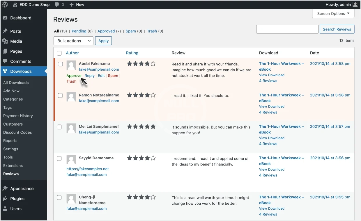Store owners are given a complete management interface for moderating, approving, deleting, and replying to product reviews from within the WordPress admin area.