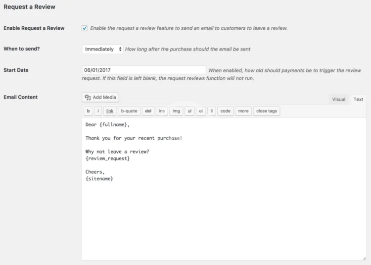 To help encourage customers to leave reviews on products they purchased, automated emails can be configured that get sent to customers after a successful purchase. Emails can be sent immediately after purchase or after a delay of several days.